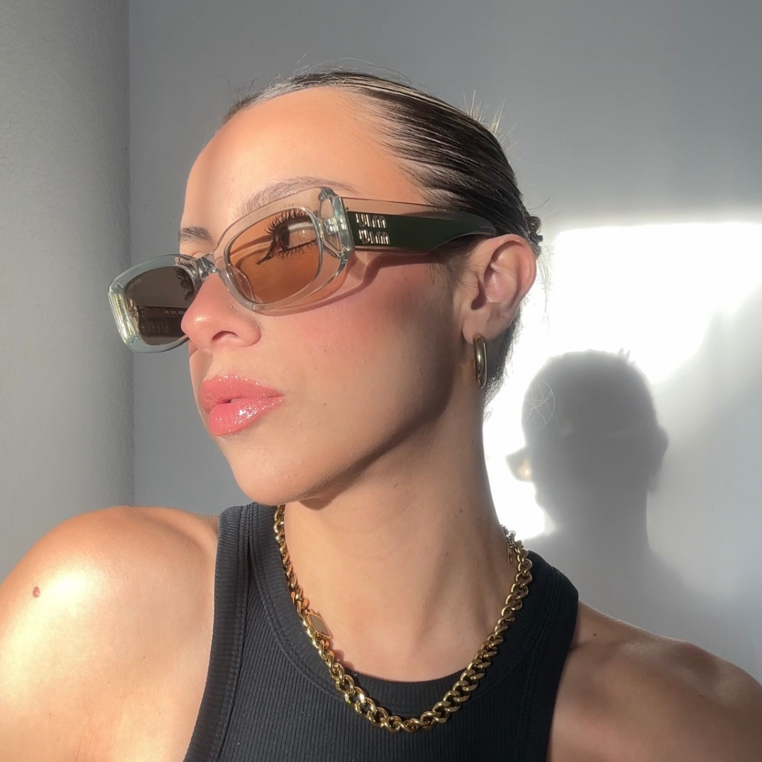 Los Miu Miu Rectangle Juta/Light Brown representan la perfecta armonía entre modernidad estructural y calidez natural. Su forma rectangular aporta carácter contemporáneo, mientras que los tonos juta y marrón claro crean una paleta que evoca la elegancia orgánica de la campiña italiana.